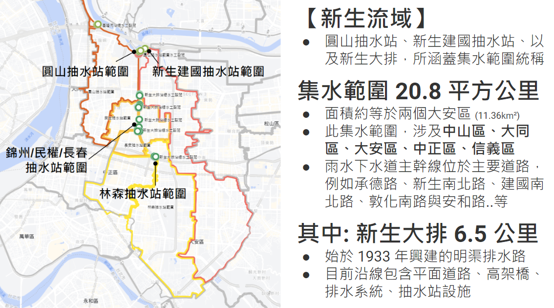 臺北市新生大排排水系統,屬於市區重要的雨水下水道主幹線,其位置大致沿著新生南北路路廊分布,此排水路徑所形成的集水範圍,由北到南涉及中山區、大安區、中正區、信義區等行政區,集水範圍約 20.8 平方公里。這段長度約 6.5 公里的通廊空間,包含著排水系統、平面道路、高架橋、抽水站設施等多元功能;另東側系統長度約 3 公里,包含排水箱涵與公園綠地、道路等。百年前的排水路所形成至今的通廊空間,肩負著城市水文、交通路廊、道路綠資源等多種功能角色。