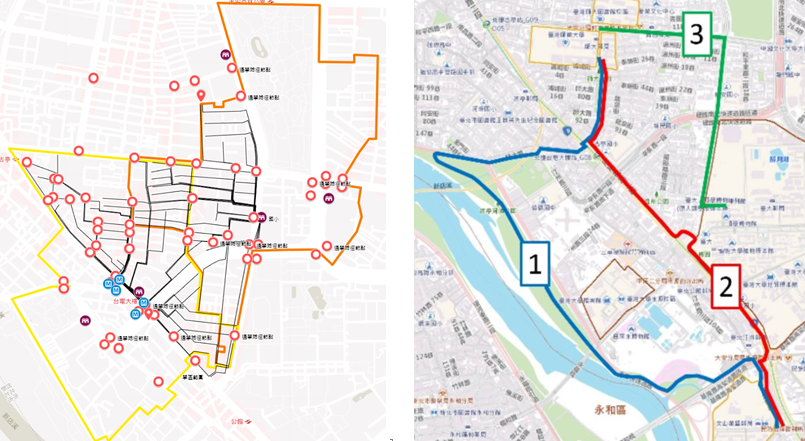 左圖:臺師大街區國小學區通學路徑推測圖;右圖:師大、臺大、臺科大三校單車主題路線