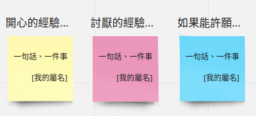 > 先想想你想寫出那類的事情,在看板上方,找到相符的便利貼顏色,點選複製,就可以得到新的便利貼囉~