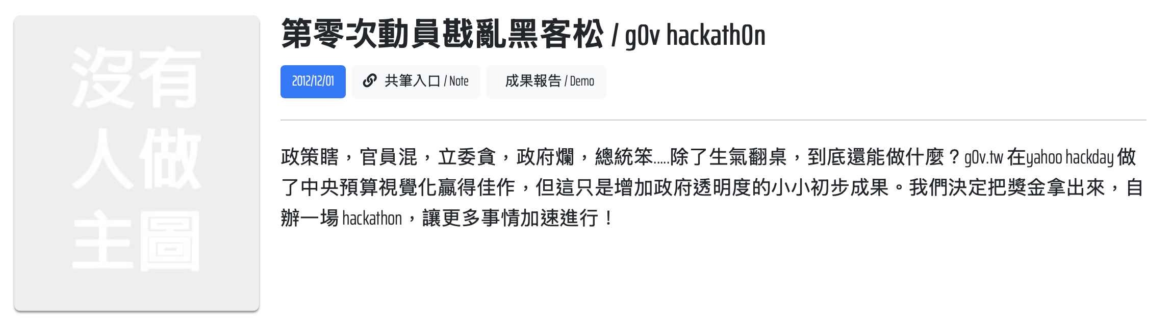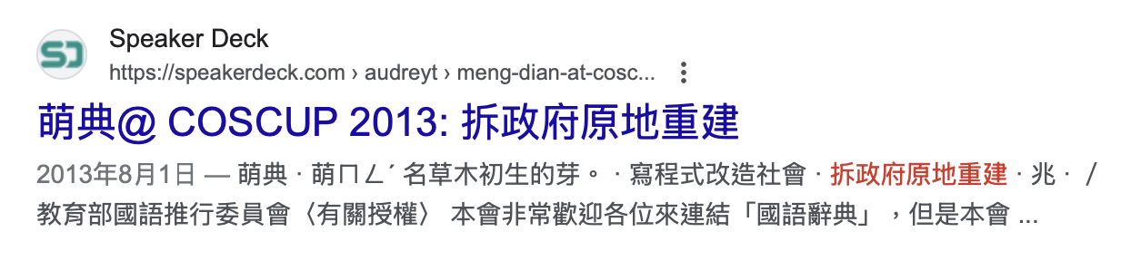 > 在g0v中,藉著共筆協作、自主參與,這股力量開始透過自由軟體「fork」的精神,嘗試抓下政府的網站,重新再製一個g0v版本的網站,落實「**拆政府,原地重建**」的精神。 最近很夯的「 ...