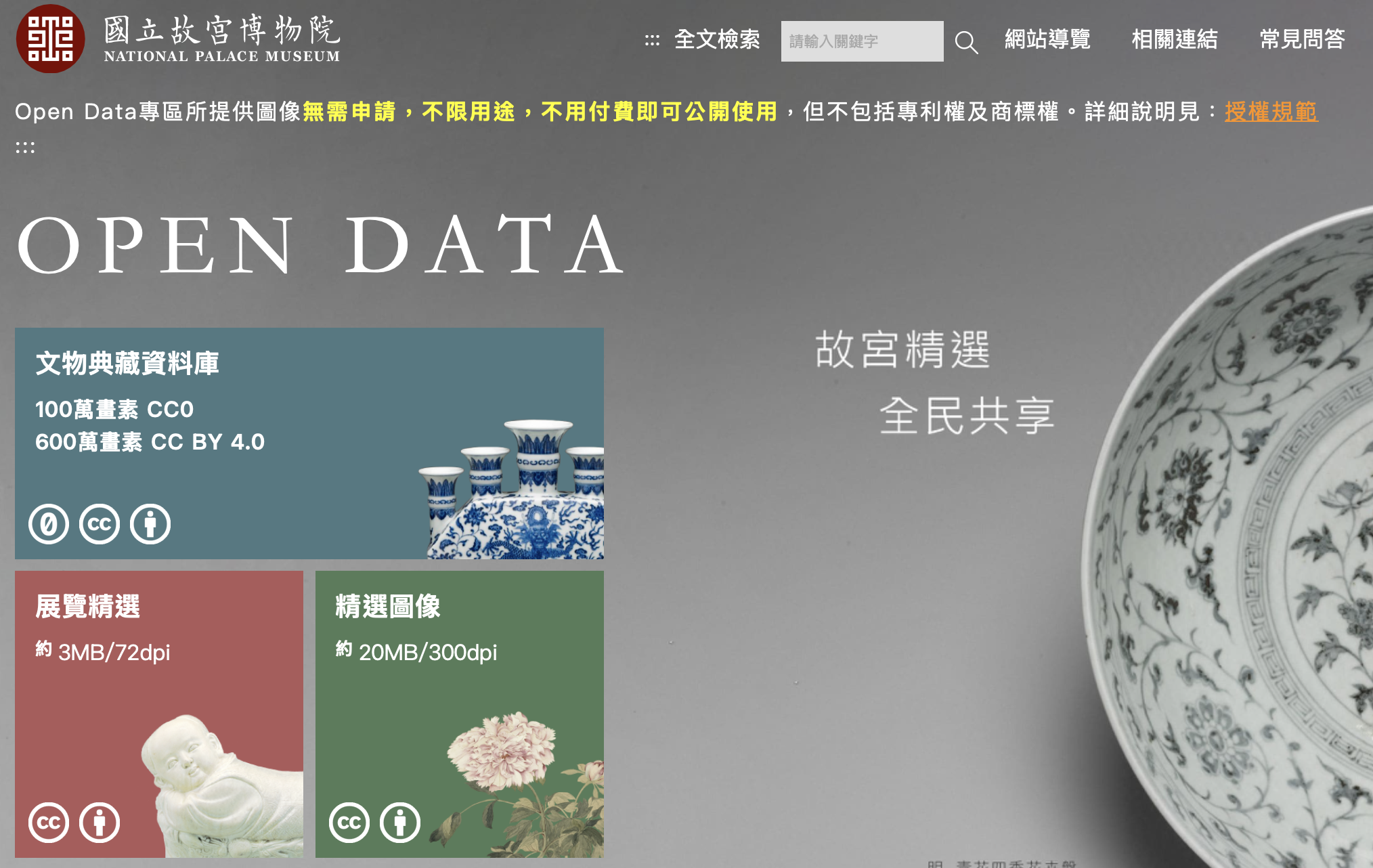 - 開放資料:data.gov.tw, [故宮開放資料](https://theme.npm.edu.tw/opendata/)