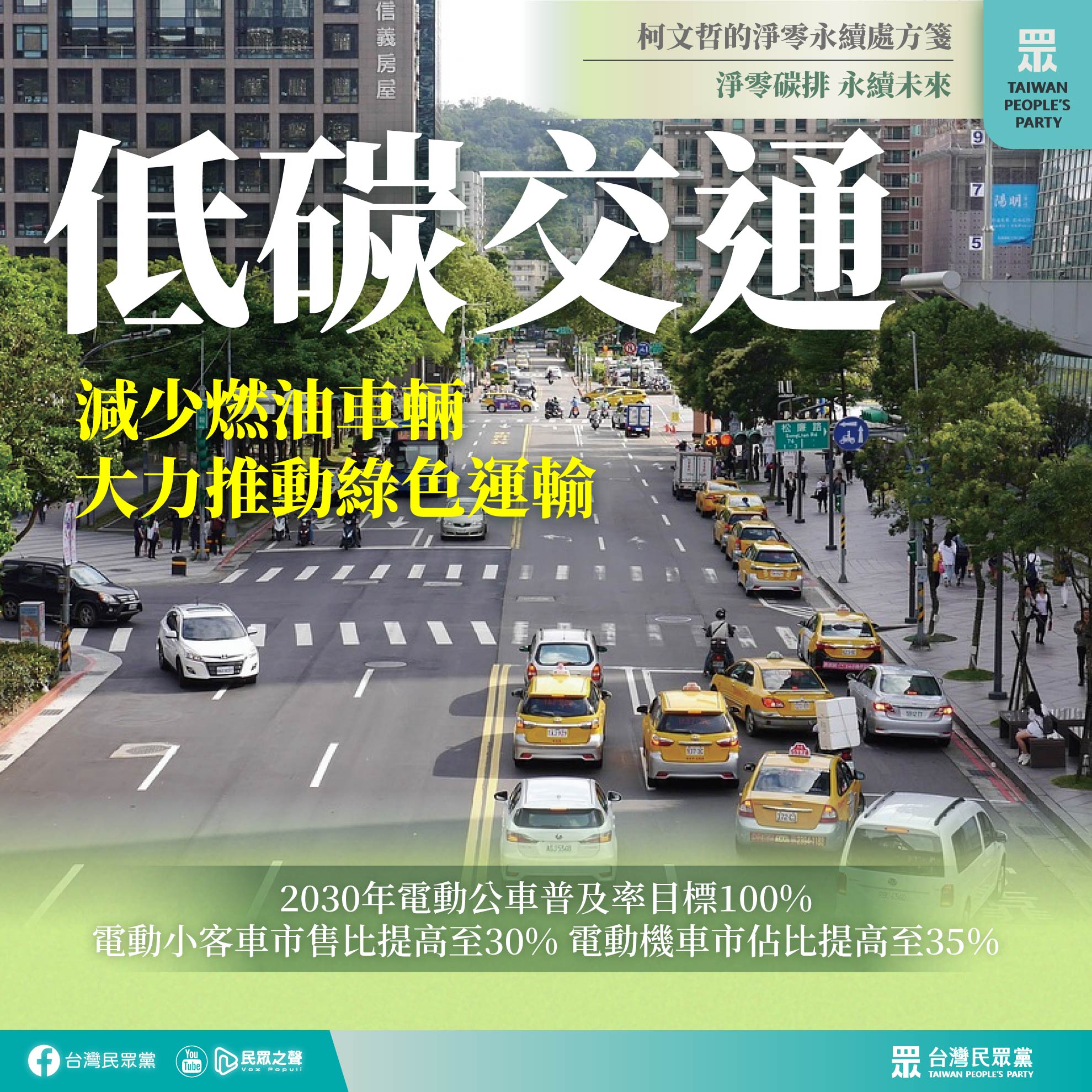 目前私人運具佔72.3%,其中又以燃油車輛為主,柯文哲主張大力推動綠色運輸,在2030年將電動公車普及率目標100%、電動小客車市售比提高至30%、電動機車市佔比提高至35%。
