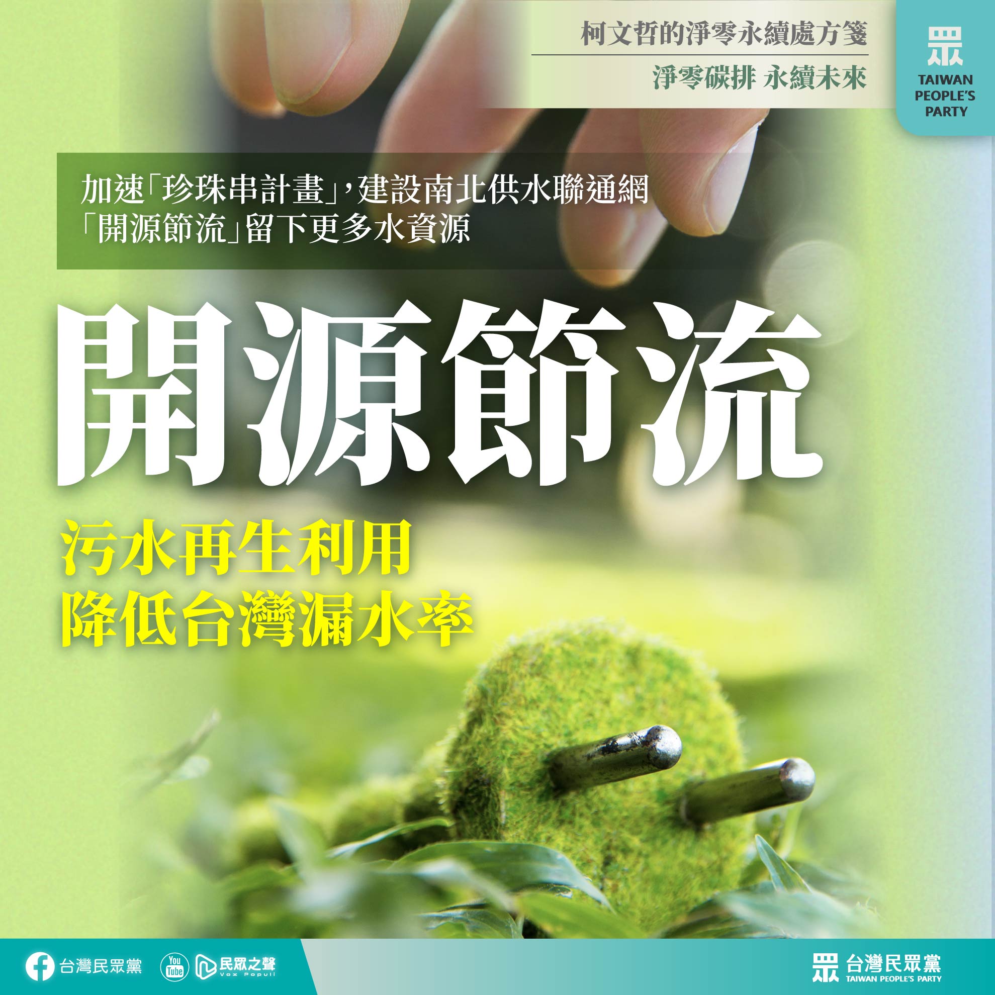 開源是指充分貯流、污水再生利用,增加可用水源;節流則是要降低台灣的漏水率,2022年全台漏水率13.1%,柯文哲力拚在10年內將漏水率降低至5%,每年可以省下相當於2.8座石門水庫的蓄水量。