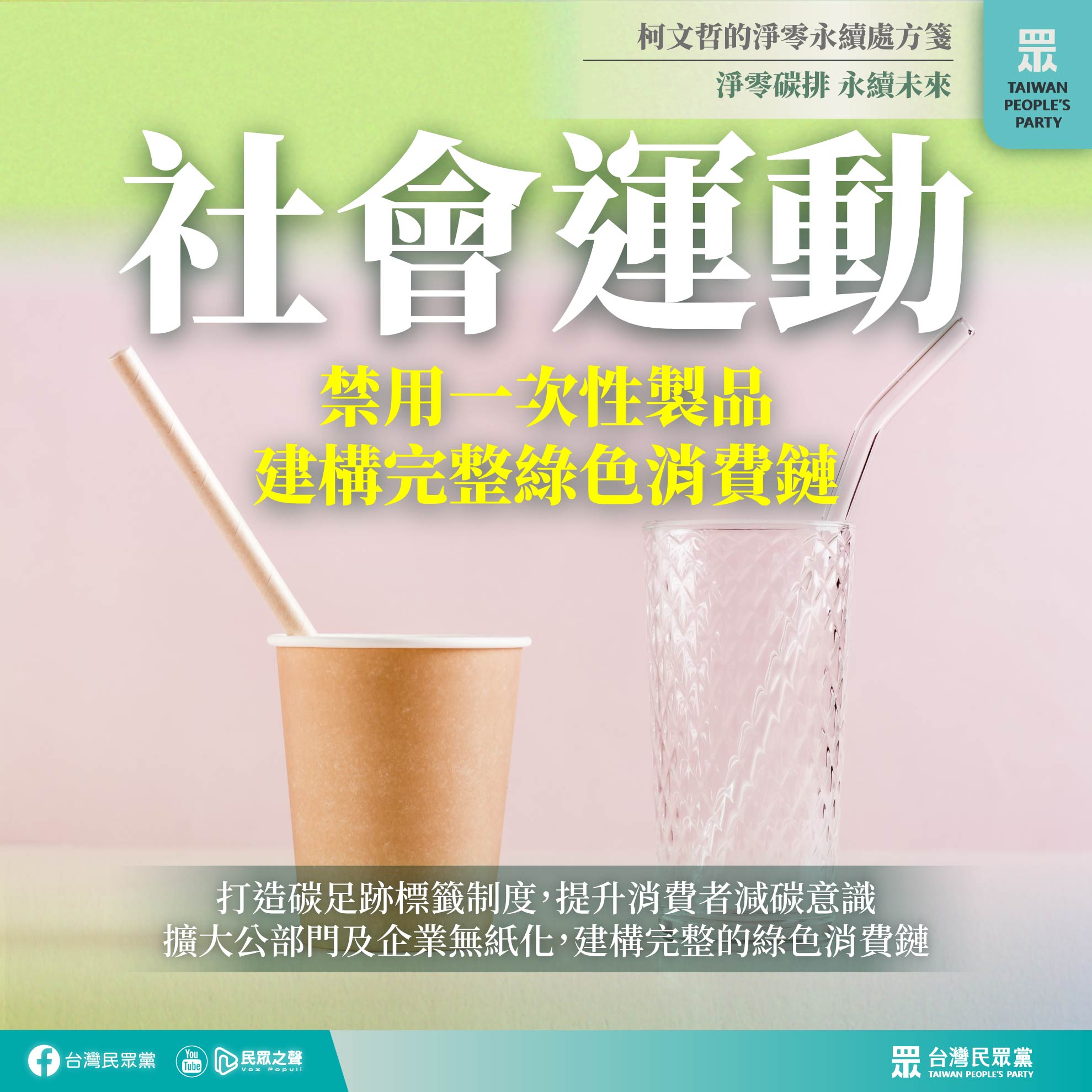 此外,減碳社會運動還包括禁用購物提袋、免洗餐具、塑膠吸管等一次性製品,並致力打造碳足跡標籤制度,提升消費者減碳意識,同時擴大公部門及企業無紙化,建構完整的綠色消費鏈。