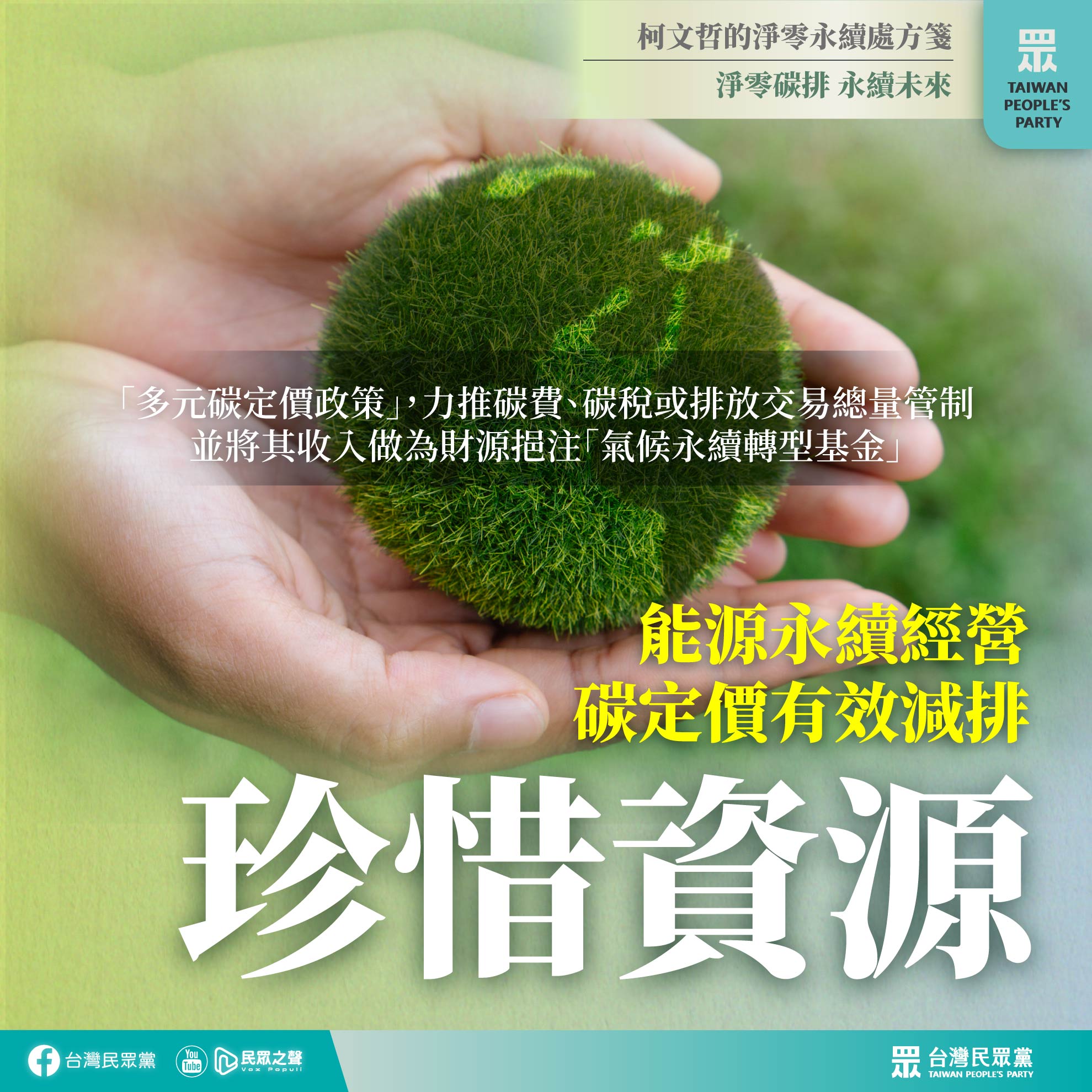 同時實施碳定價,藉此接軌國際,柯文哲提出「多元碳定價政策」,力推碳費、碳稅或排放交易總量管制,並將其收入做為財源挹注「氣候永續轉型基金」,以碳稅收入做為財源,用於補貼弱勢,促進社會公平,也要公布碳定價收入和使用情形。