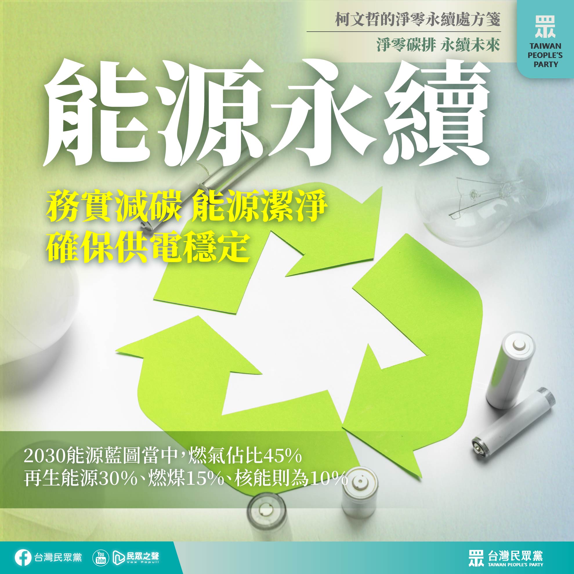 就是負責任!柯文哲總統參選人提出「淨零碳排,永續未來」政策,並訂下2030能源占比目標,包括燃氣45%、再生能源30%、燃煤15%、核能10%,要用最穩健務實的態度,帶領台灣走向世界!