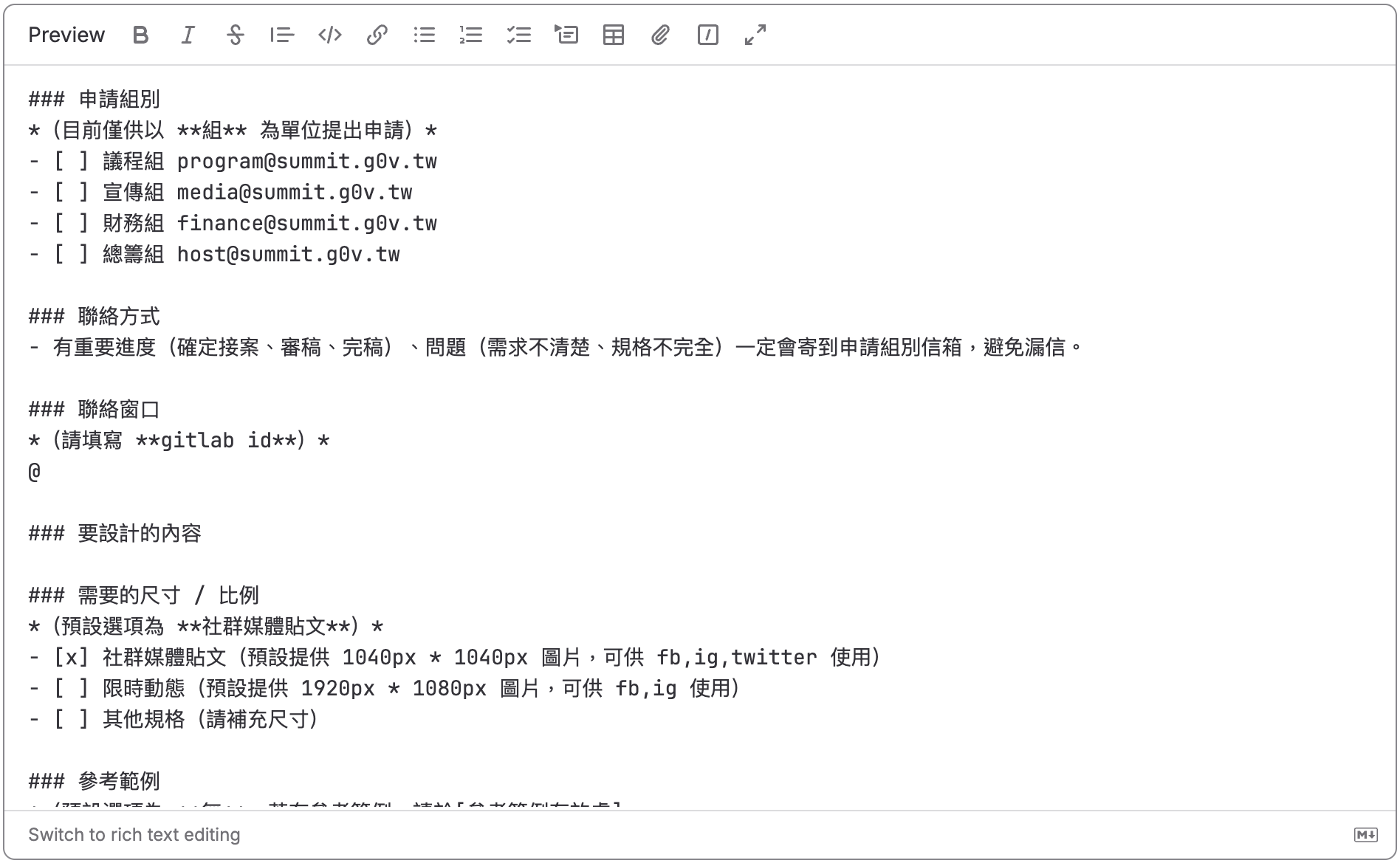 若有特殊配圖需求(例如特殊尺寸、參考範例等),請自行開立設計票,並將社群票關聯到該張設計票中,如有問題,請參考[如何開設計票?](https://g0v.hackmd.io/aDqDQkP4Ti2Wu0dLfH_m0Q?both#%E5%A6%82%E4%BD%95%E9%96%8B%E8%A8%AD%E8%A8%88%E9%9C%80%E6%B1%82%E7%A5%A8%EF%BC%9F)說明。